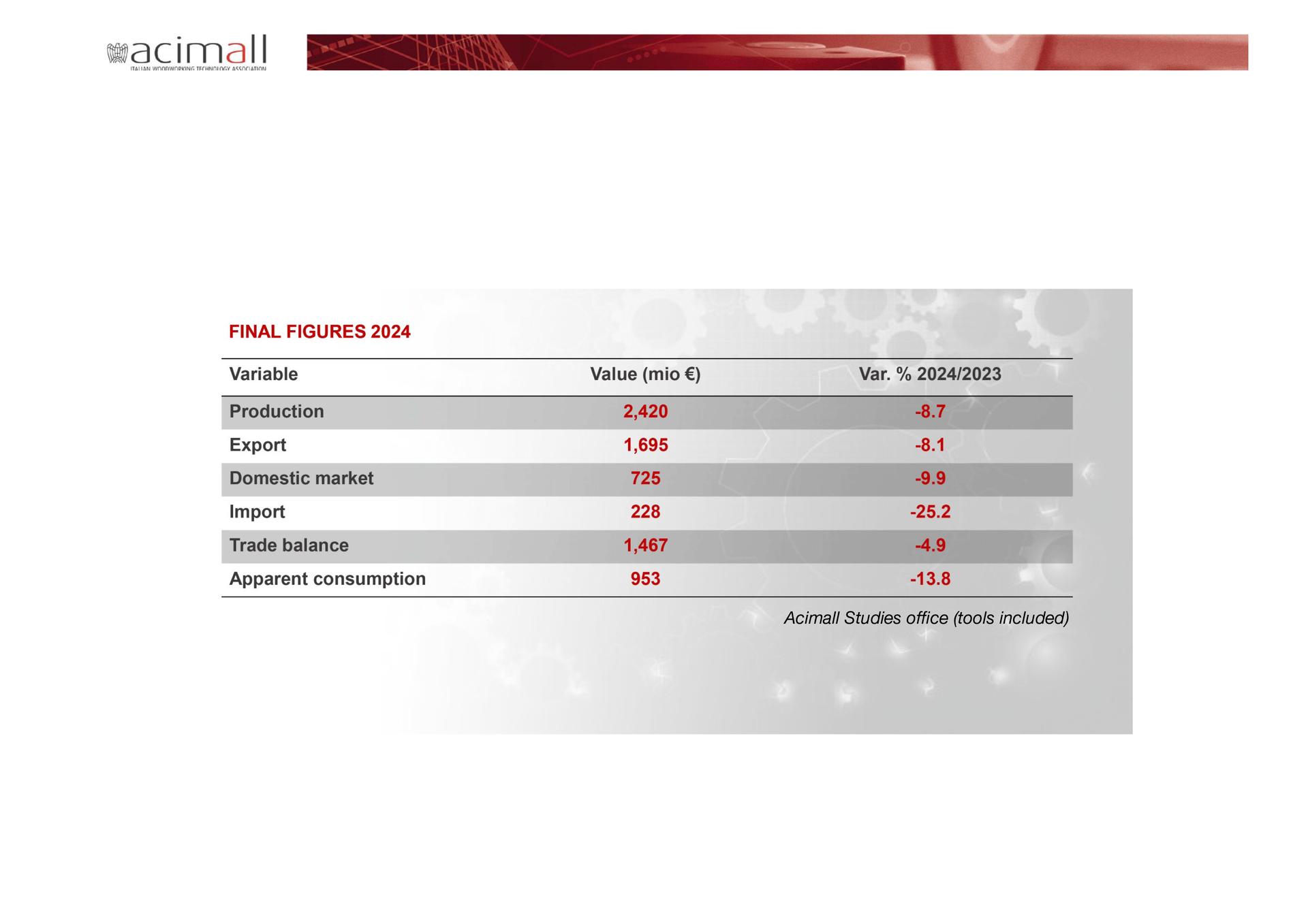 Plenty of topics are emerging from the statistical surveys of Acimall, the association of Italian manufacturers of technologies for wood and wood-based materials: from the vital need to increase the size of businesses to the effects of the conflicts in Ukraine and Palestine, shared with the entire world economy; from the worries for tariffs introduced by the United States to the need of keeping the best balance between an ever relevant domestic demand and export flows that are the real compass of this industry.