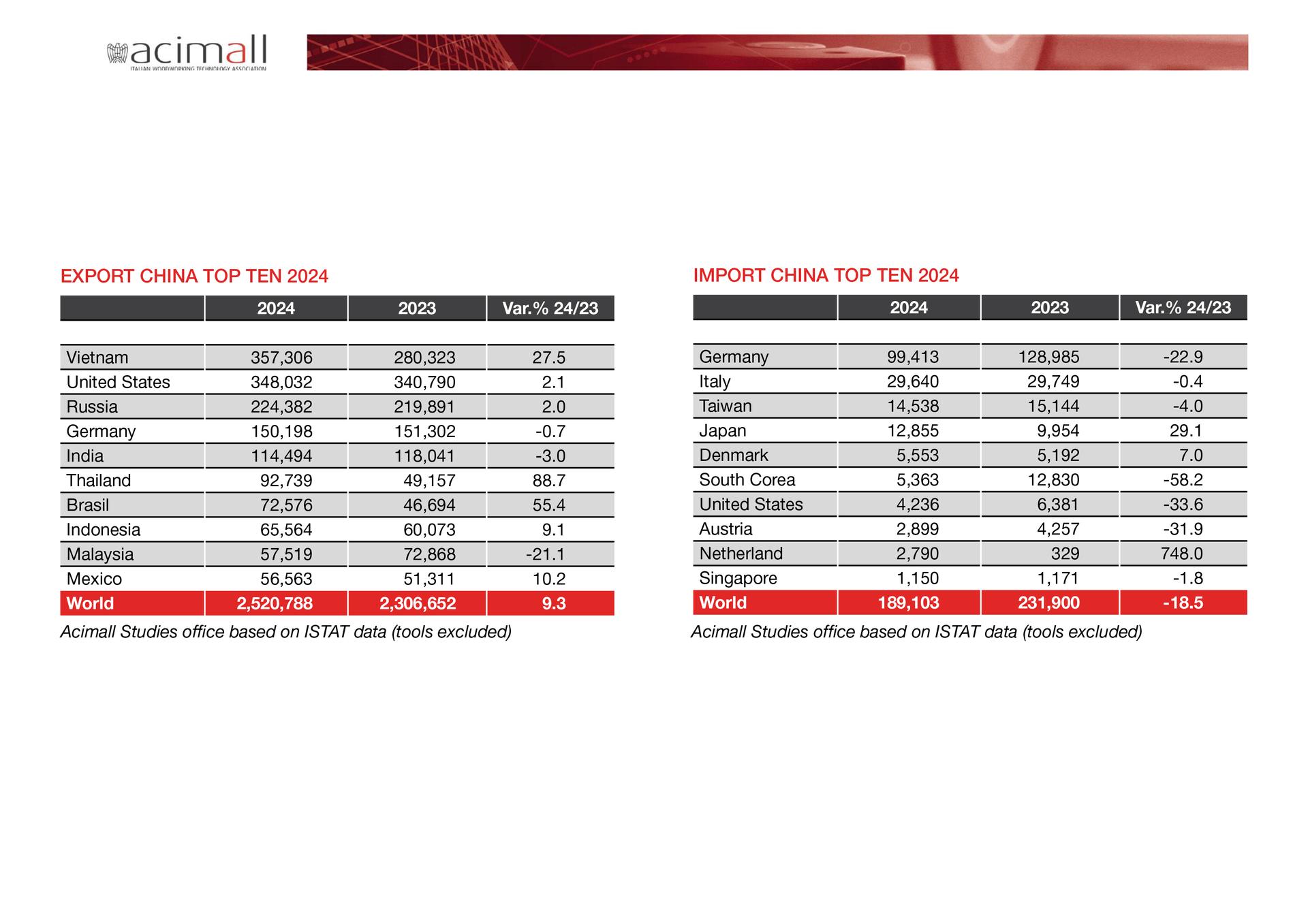 On the import side – which amounted to 189.1 million euro versus 231.9 in 2023 (down 18.5 percent) – the gold medal for the top supplier country goes to Germany, although it lost 22.9 percent in value (from 128.9 million in 2023 to 99.4 last year). Italy held on tight at number two with 29.6 million (minus 0.4 percent), thus overtaking Taiwan, which was second in 2023 and third in 2024, with sales to China amounting to 14.5 million euro, 4 percent less than in 2023.