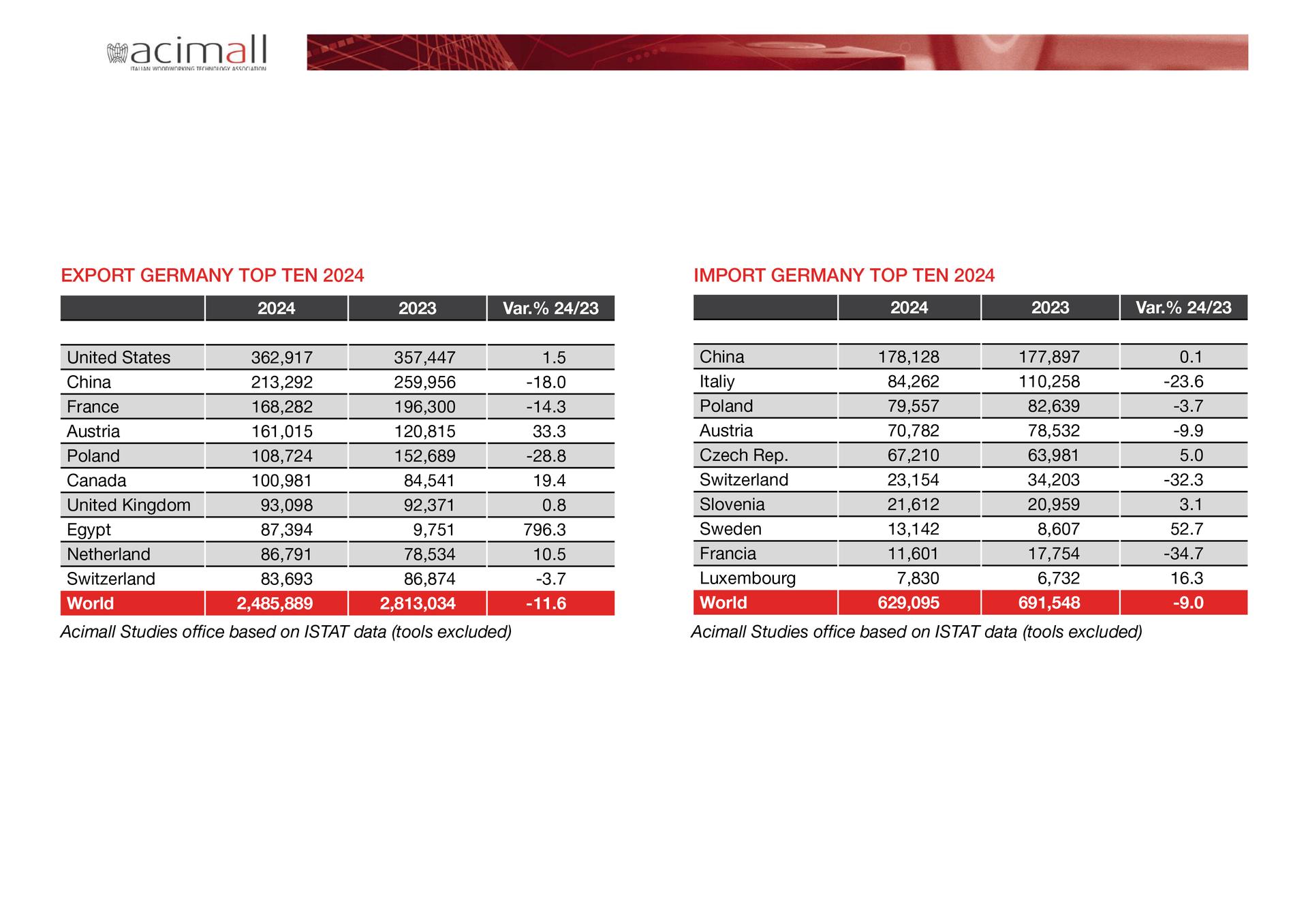 Let’s now move on to Germany, a historical leader of international trade, with 2.485 billion euro export (excluding tools), down 11.6 percent from 2.813 billion in 2023. This means a reduction by 11,6 percent, worse than the 8.1 percent drop recorded by Italian manufacturers. Also for Germany, the top-ten destination countries are the United States (362.9 million euro, up 1.5 percent), followed by China (213,2 million euro, down 18 percent) and France (168 million, down 14.3 percent). The ranking continues with Austria, Poland, Canada, the UK, Egypt, the Netherlands and Switzerland. Egypt recorded a real exploit in percent terms, growing from 9.7 million in 2023 to over 87 in 2024 (plus 796.3 percent).